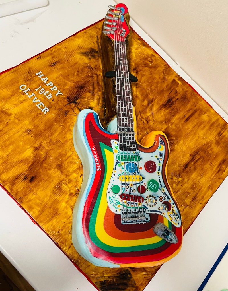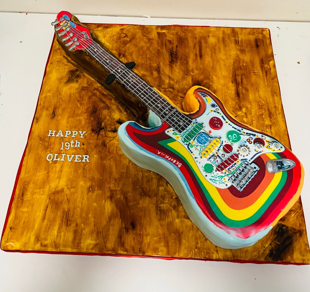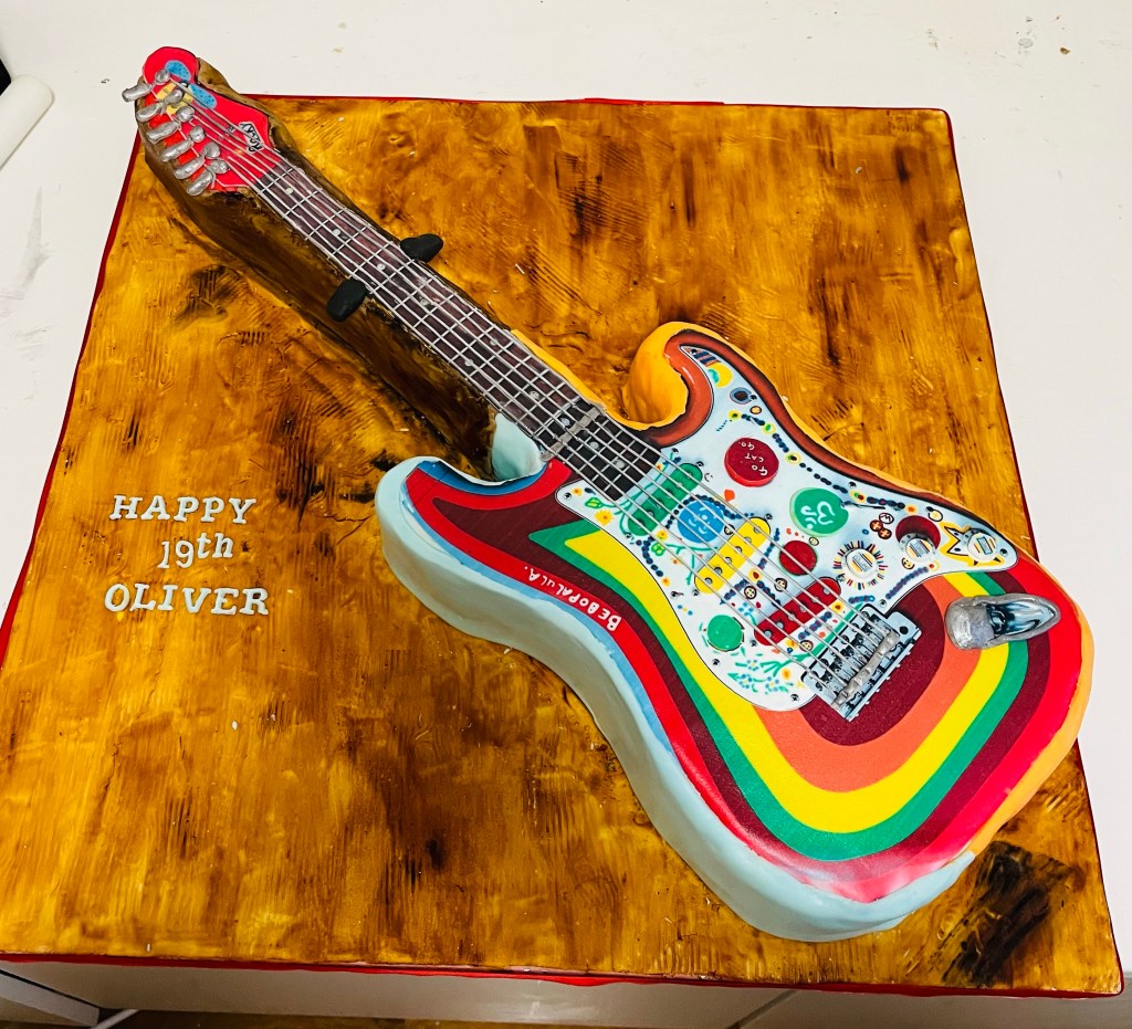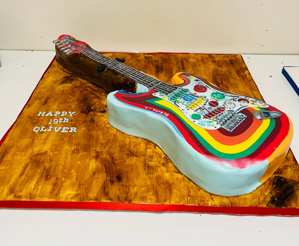 A few of my latest cakes I hope you all had a good Easter break, back to school and work today, here are a few of my recent birthday cake bakes Chocolate sponge guitar cake based on George Harrison’s hand painted “Rocky” Fender Stratocaster Share this: Click to share on Facebook (Opens in new window) Facebook Click to share on Threads (Opens in new window) Threads Click to share on WhatsApp (Opens in new window) WhatsApp Click to share on X (Opens in new window) X Like Loading...