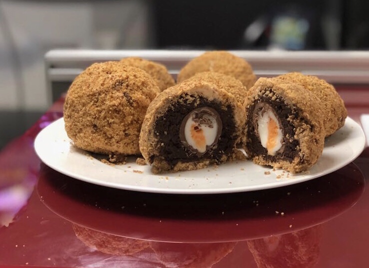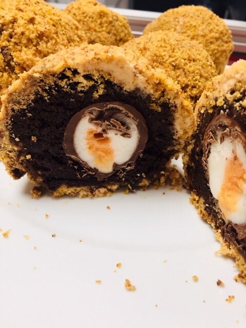Chocolate fudge cake and strawberry cake disguised as pastry, first go at chocolate scotch eggs too